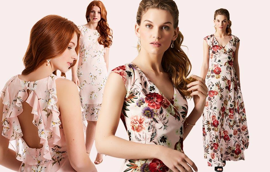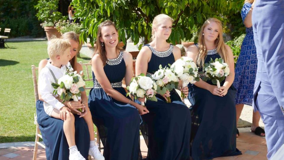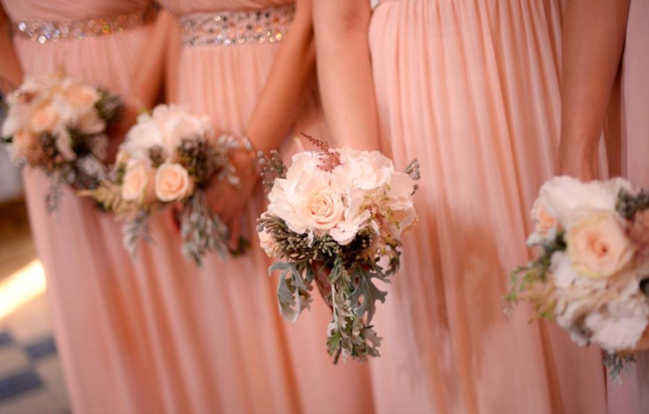 Sådan styler du dine brudepiger i forskellige kjoler - men i samme farveskala.